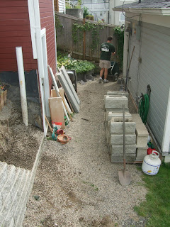 There is a drain that runs behind the wall and we are building a French drain between the house and garage to help water flow away from the house foundation and into the yard areas. We have a lot of gravel and hopefully water isn't an issue but since we live in the rainiest area of the country, we are over preparing.